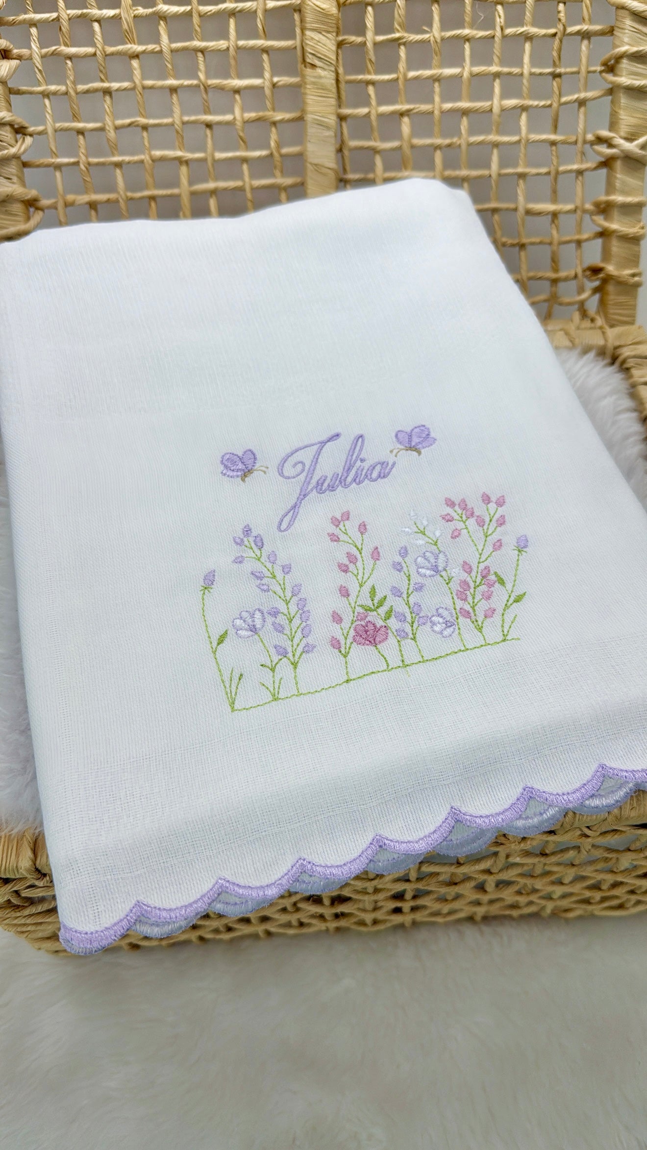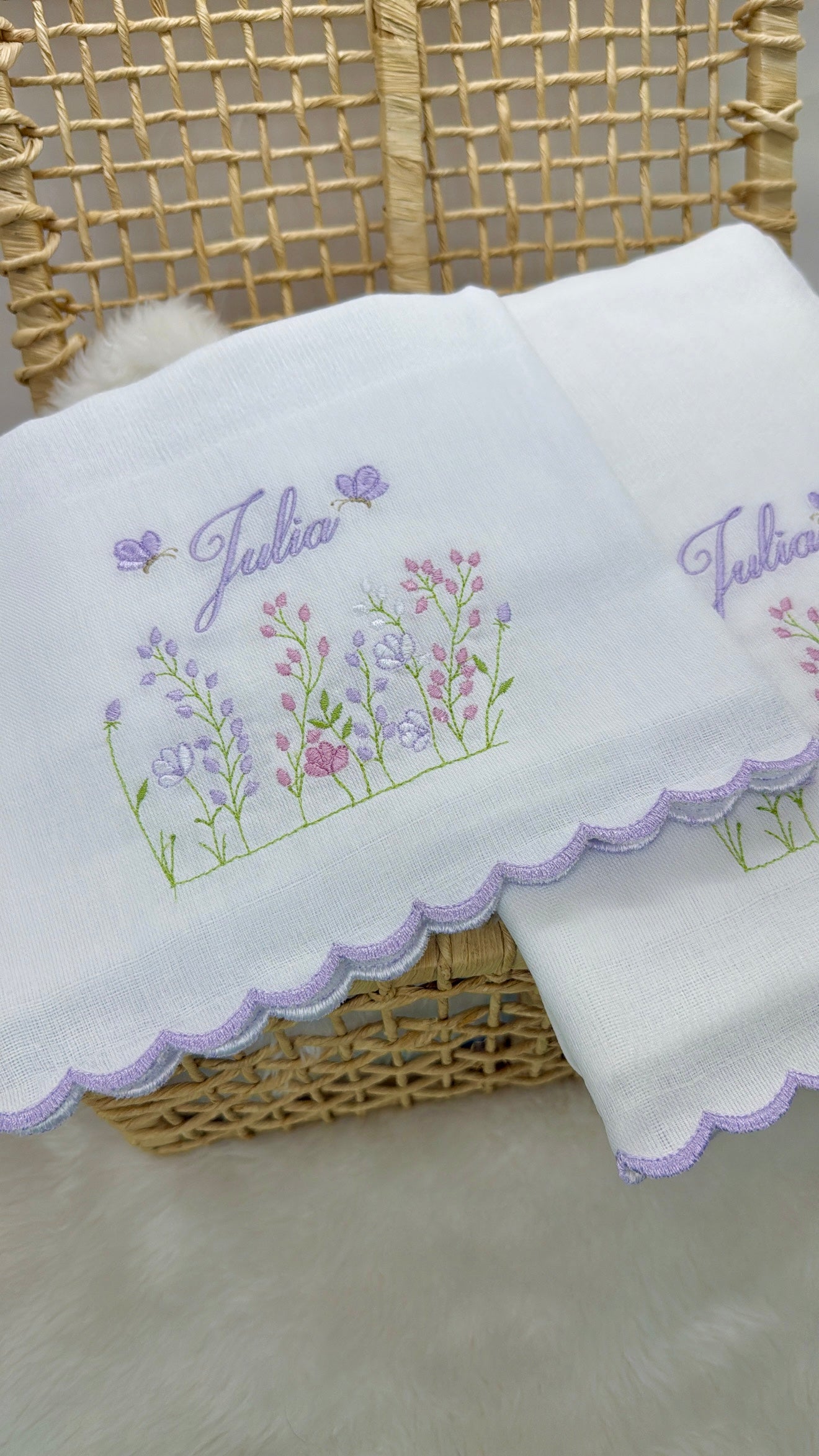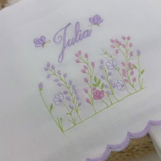 Ambas as peças são bordadas com o tema jardim, trazendo suavidade e poesia para a rotina. Um presente especial ou um mimo essencial para quem está montando o enxoval com amor.